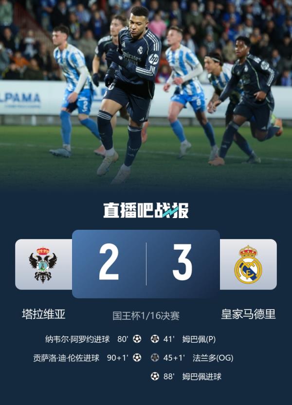 姆巴佩双响+造乌龙+两失单刀,皇马3-2塔拉维亚,晋级国王杯16强。