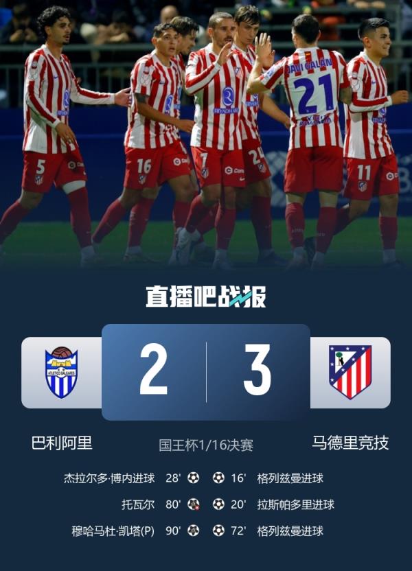 朗格莱伤退,格列兹曼双响,拉斯帕多里破门,穆索送点+扑点,最终马竞3-2巴利阿里晋级下一轮。